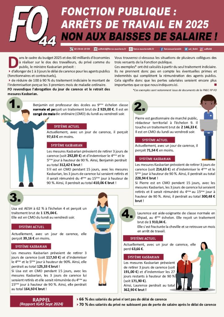 Alors que les services publics sont d’ores et déjà exsangues, les dernières annonces gouvernementales visent tout particulièrement les agents publics (fonctionnaires et non titulaires), avec notamment les mesures Kasbarian concernant les arrêts de travail. Vous trouverez ci-dessous le document de l’Union Départementale qui illustre les pertes de salaires liées aux mesures Kasbarian, ainsi que le communiqué de FO Fonction Publique, daté de ce jour, qui se conclut ainsi : « à 3 jours de carence, FO Fonction Publique propose 3 jours de grève et de mobilisation aux autres organisations syndicales ».