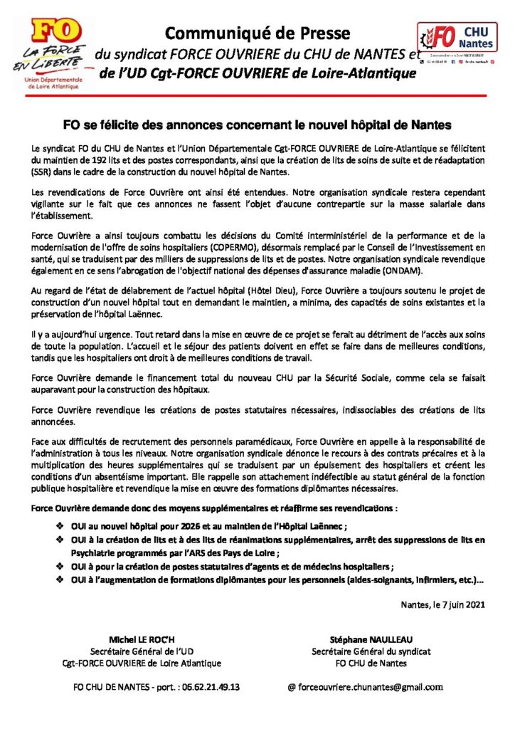 Partager la publication "FO se félicite des annonces concernant le nouvel hôpital de Nantes"