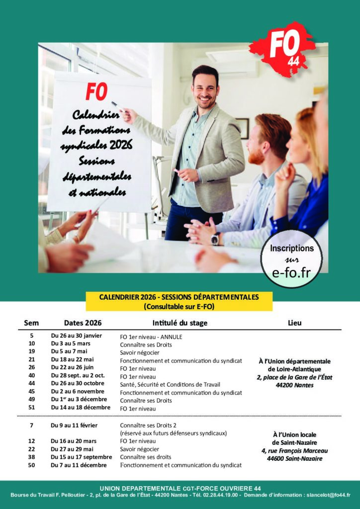 Vous trouverez ci-dessous, les fiches des sessions de formation syndicale organisées par le Centre de Formation des Militants Syndicalistes (CFMS) à l’Union départementale CGT-FO 44 et à l’Union locale de Saint-Nazaire en 2025.