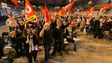 À l’intérieur, un comité d’accueil distribue des drapeaux aux couleurs de FO pour les uns et de la CGT pour les autres. Une fanfare invite à chalouper sur une partition jazz New Orléans. Les rangées de chaises encore vides un quart d’heure plus tôt sont désormais occupées par plusieurs centaines de militants syndicaux. Il est 18h30, le meeting peut commencer.