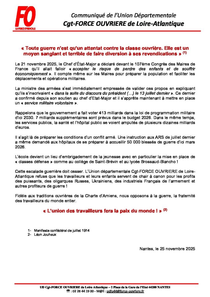 Communiqué de l’Union DépartementaleCgt-FORCE OUVRIERE de Loire-Atlantique