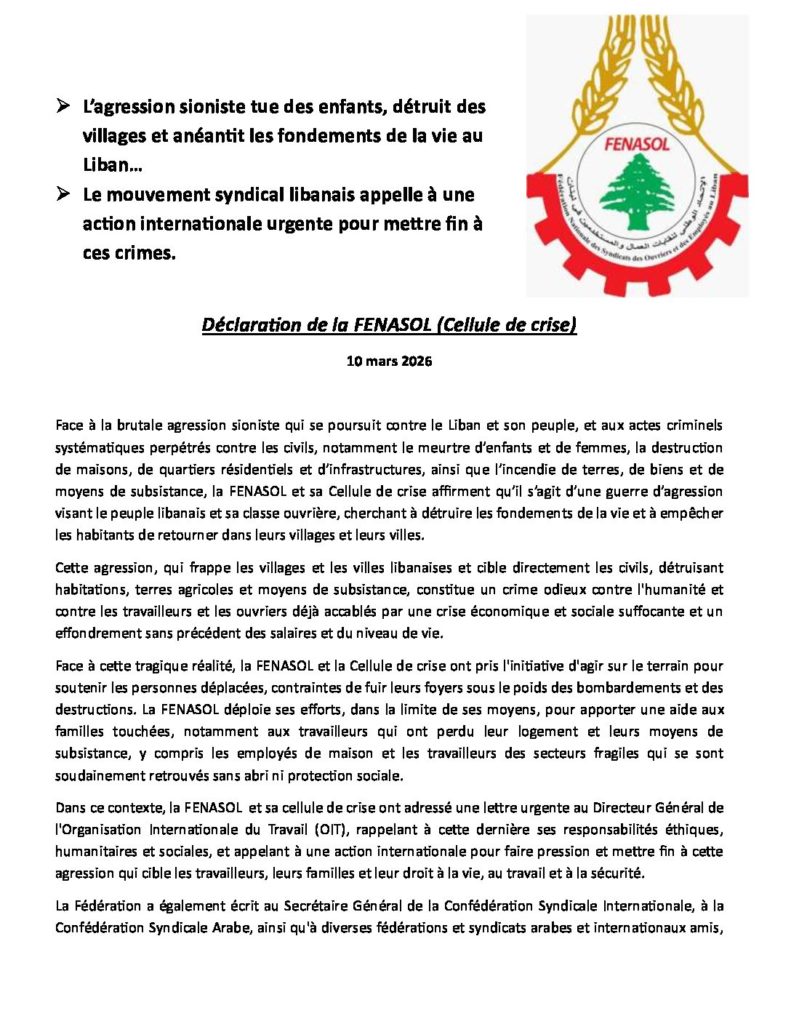 Vous trouverez également ci-après le message que l’Union Départementale, par l’intermédiaire de son secrétraire général, Michel Le Roc’h, vient d’envoyer à la Fédération nationale des syndicats des ouvriers et des employés du Liban (Fenasol), en réponse à leur déclaration syndicale du 10 mars, qui en appelle à la solidarité internationale (ci-dessous) :