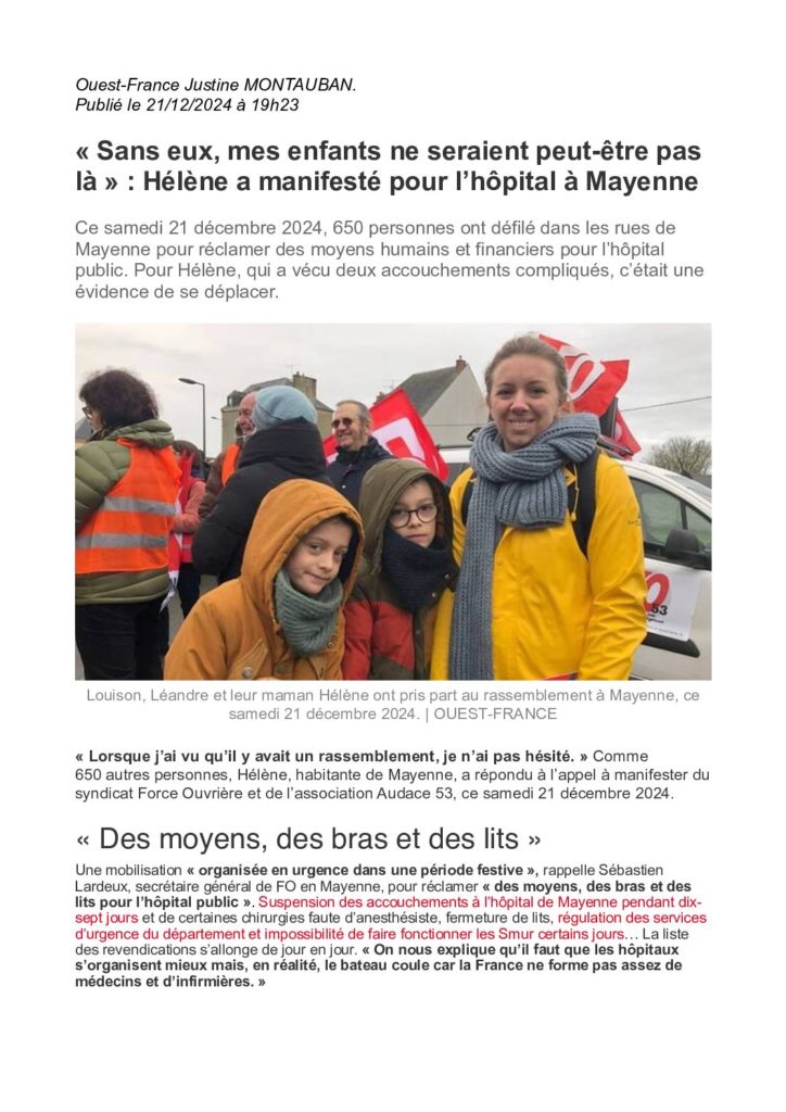À l’appel du Groupement départemental FO 53, de l’Union départementale FO 53 et de l’association d’usagers Audace 53, 700 manifestants ont rejoint la sous-préfecture ce samedi 21 décembre, pour exiger le maintien des blocs et de la maternité.
