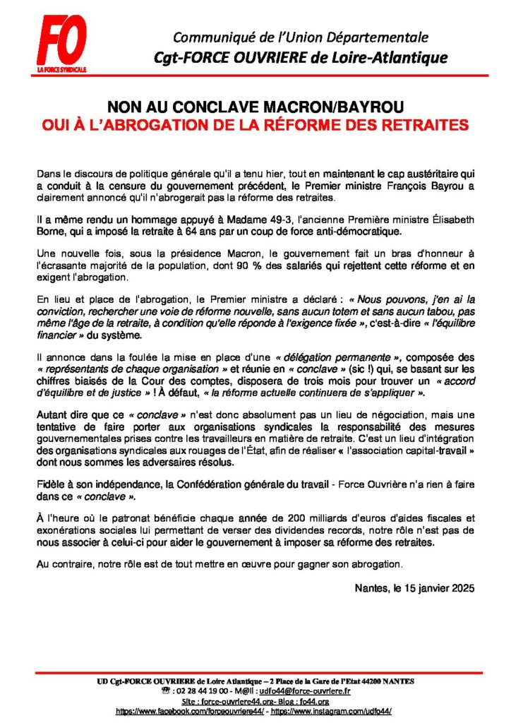 Partager la publication "NON AU CONCLAVE MACRON/BAYROU OUI À L’ABROGATION DE LA RÉFORME DES RETRAITES"