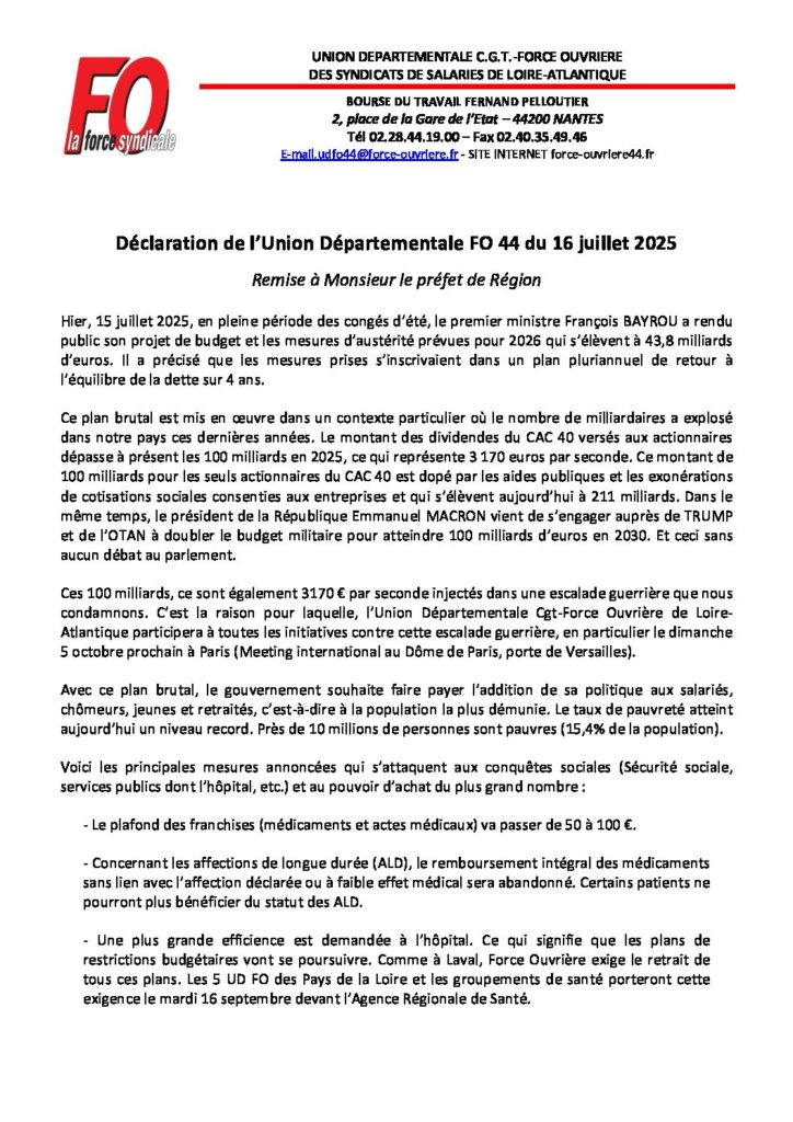 Ce mercredi 16 juillet, l’Union départementale FO 44 a organisé un rassemblement devant la Préfecture à Nantes contre les mesures d’austérité annoncées le 15 juillet par le Premier ministre François Bayrou.