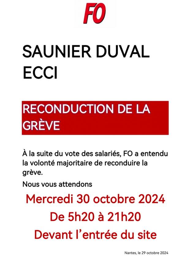 Suite aux négociations infructueuses de ce jour avec leur direction, les salariés de Saunier Duval lors de leur Assemblée générale ont voté la reconduction de la grève demain à partir de 5h20.