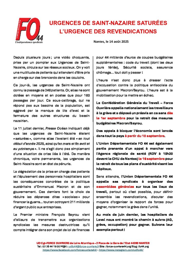 En s’appuyant sur le préavis de grève de la Confédération dès le 1er septembre, de la multiplication des appels à bloquer le pays à partir du 10 septembre et de l’initiative de marcher vers l’ARS le 16 septembre, ainsi que sur l’exemple victorieux des hospitaliers de Laval en juin (AG, grève, occupation), l’Union Départementale invite toutes les structures FO du département à organiser des assemblées générales sur leurs lieux de travail pour construire le rapport de forces capable de rompre définitivement avec leur politique, qui nous met en danger.